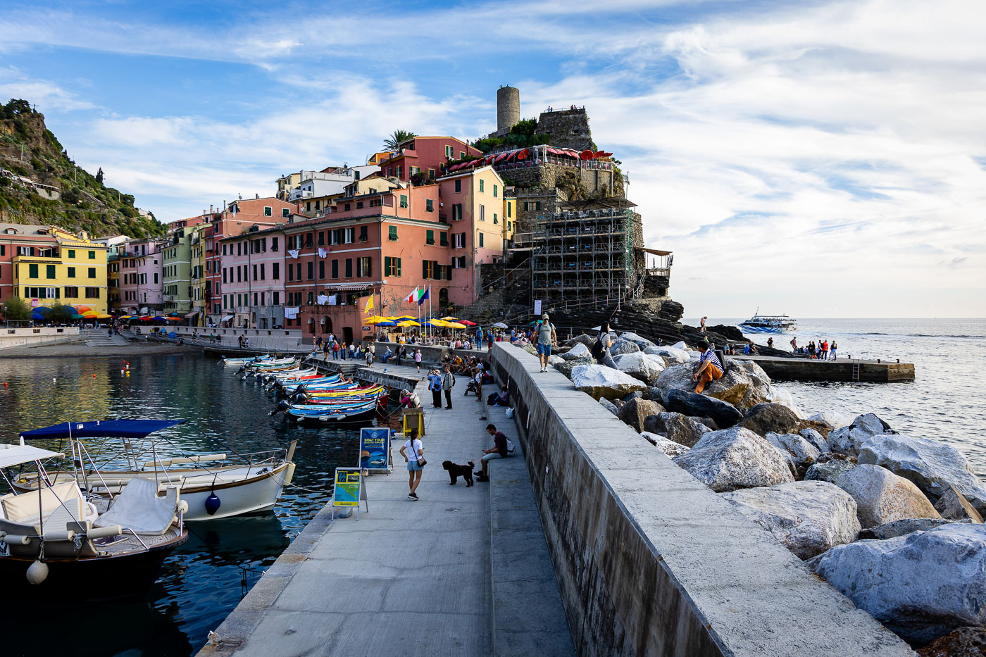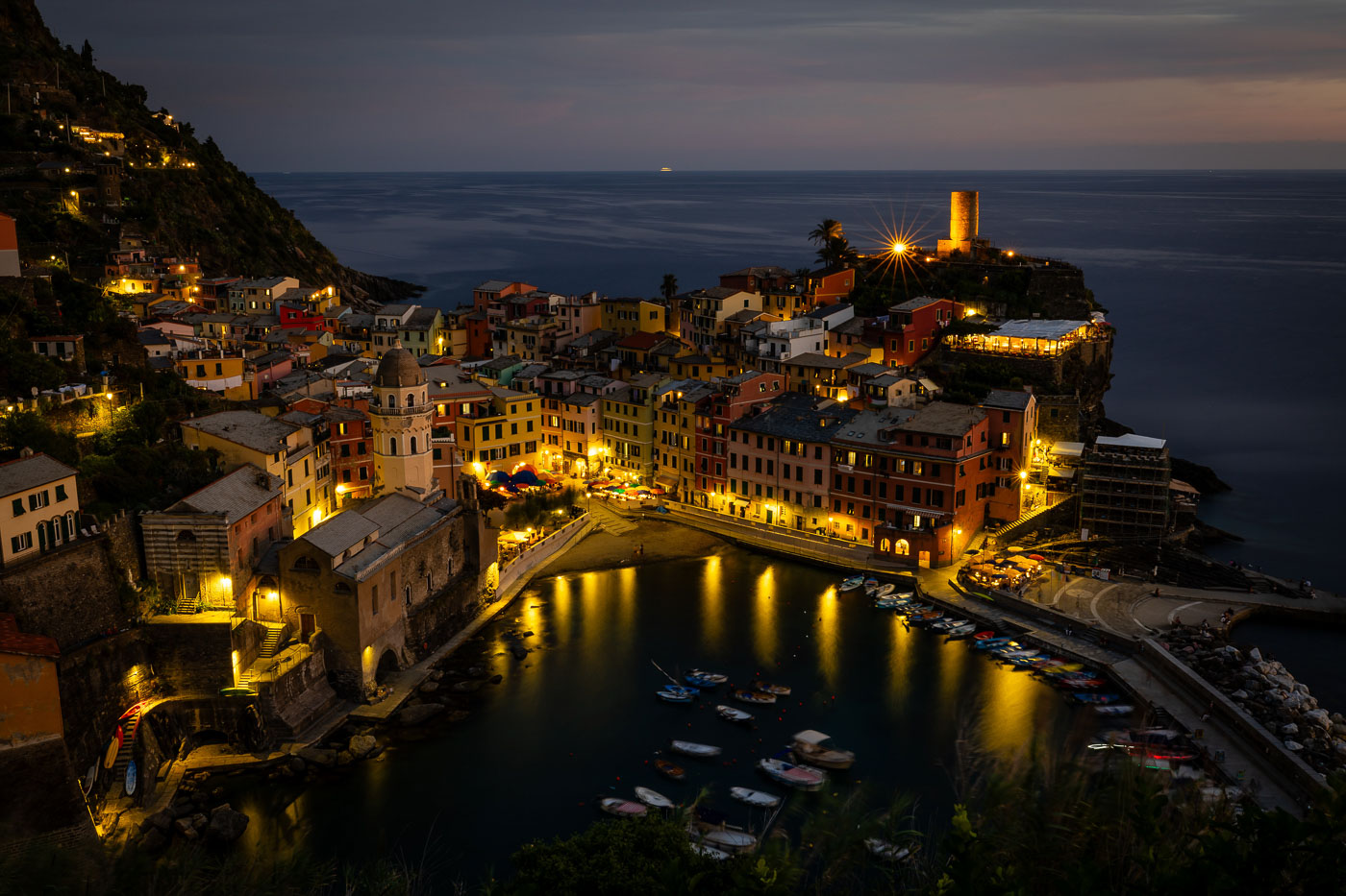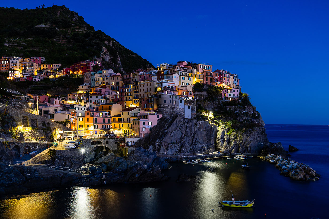 We wandelen bovenlangs de wijngaarden waar de beroemde Sciacchetrà-wijn vandaan komt en zoeken in de avond een goed standpunt voor de klassieke foto van Manarola bij zonsondergang. De lucht kleurt zacht oranje en later diepblauw, terwijl de lichtjes in de huizen aangaan. Iedere fotograaf hoopt op dat ene moment – en vanavond was het raak.