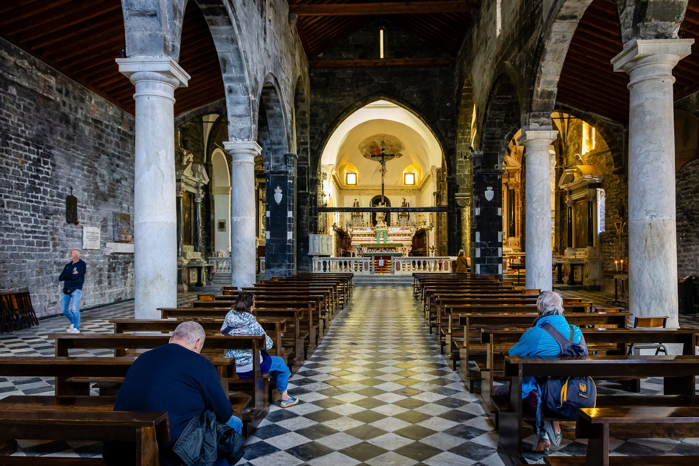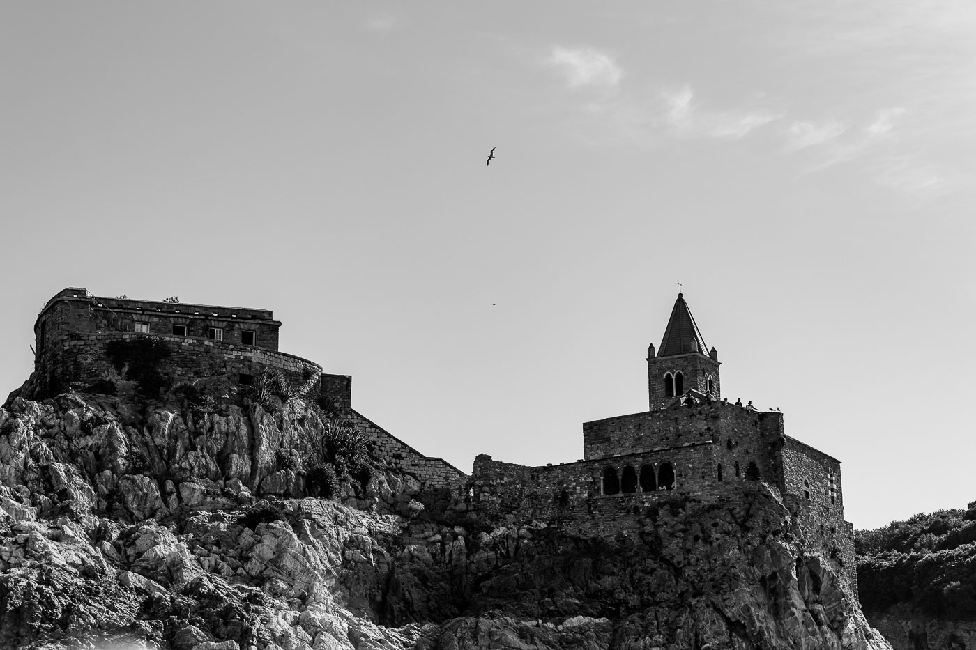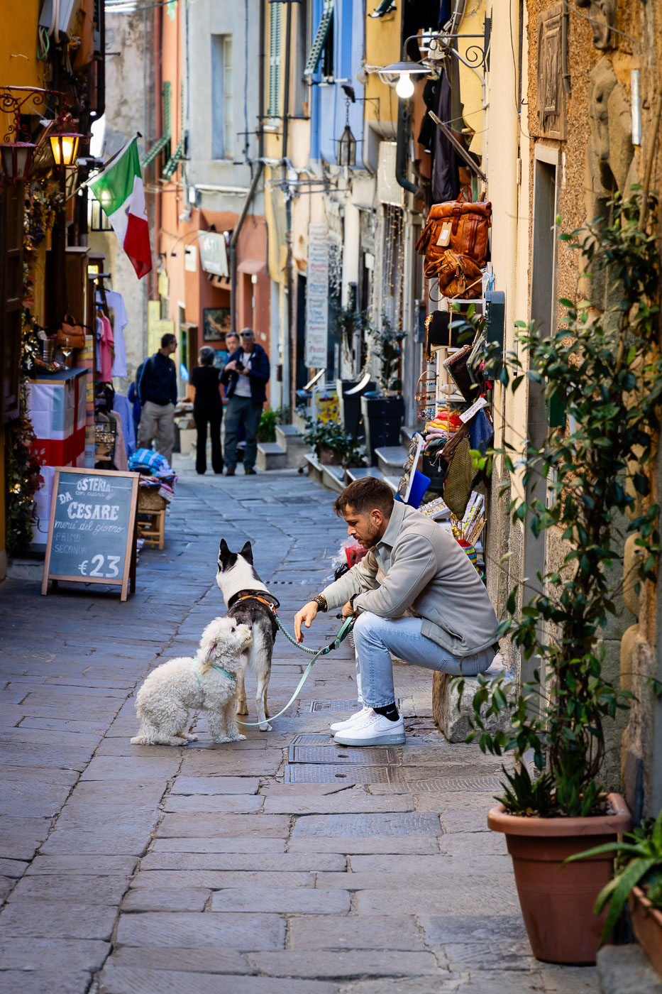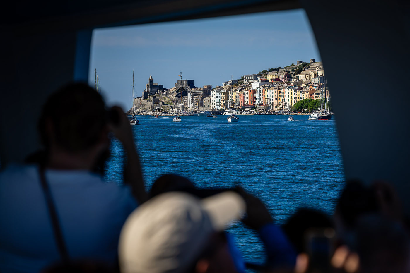 De laatste volledige dag brengt ons naar Portovenere, officieel geen onderdeel van de Cinque Terre maar minstens zo fotogeniek. De gekleurde gevels aan het water, de grijze kerk op de rots en de kronkelende straatjes zijn een feest om te fotograferen. Onderweg worden we ingehaald door schoolklassen in blauwe hoodies, wat vrolijke contrasten oplevert in het straatbeeld.