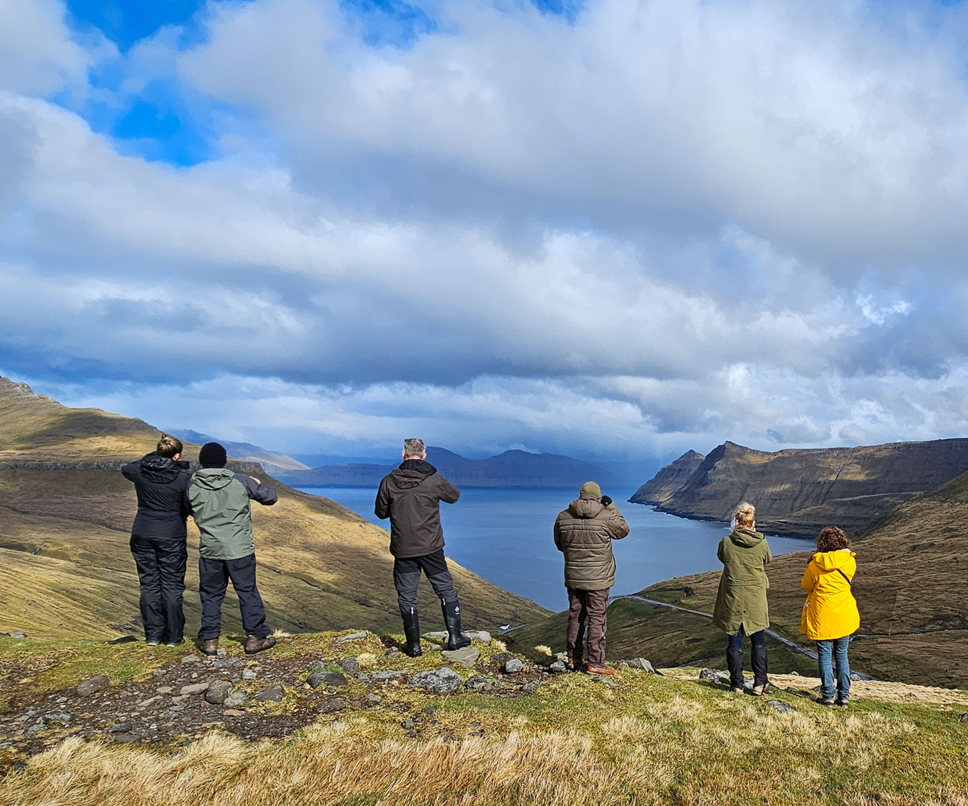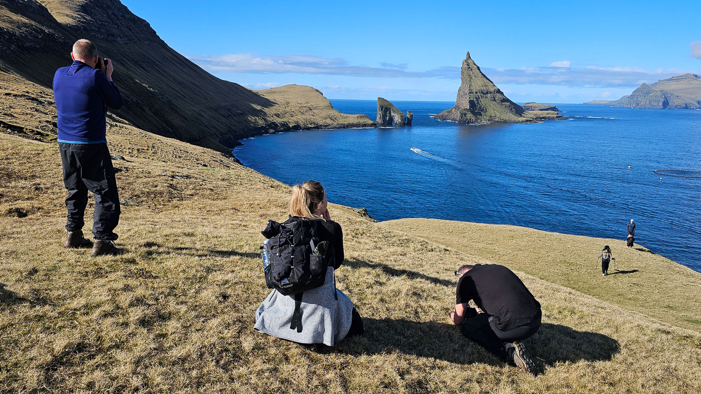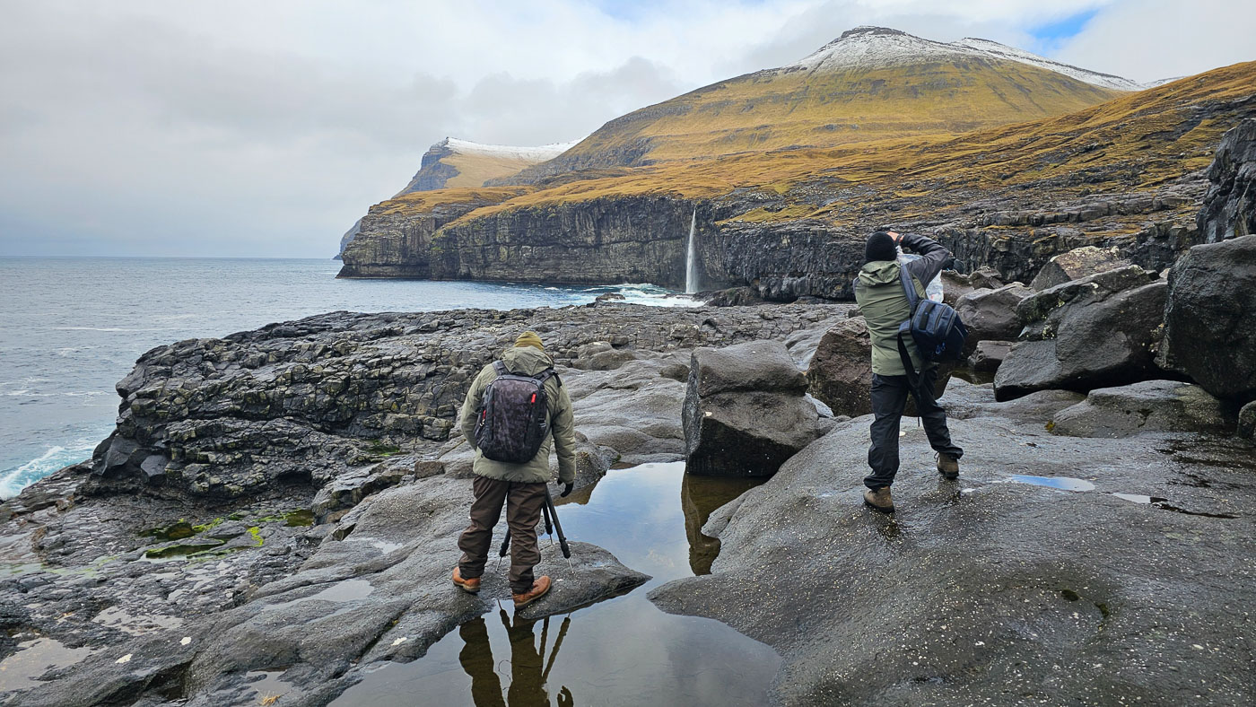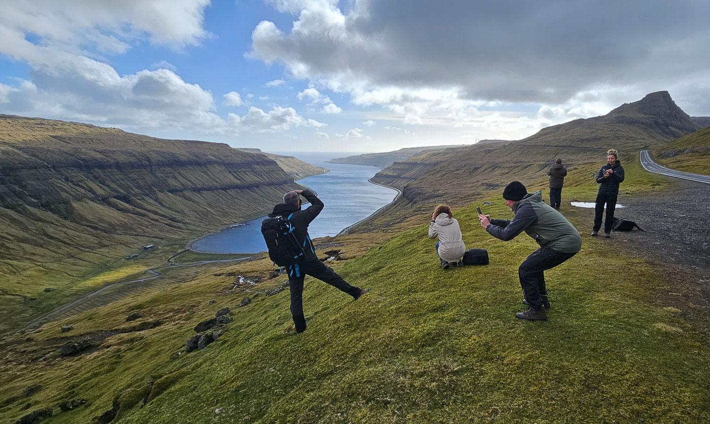 De volgende dag trokken we er meteen op uit. Zwaarbewolkt, maar droog genoeg om op pad te gaan. Vanaf Sornfelli genoten we van het uitzicht over de fjorden, daarna door naar het meer boven de zee – Sørvágsvatn. Wind tegen, zon mee. Wat een plek! Op de terugweg zagen we een regenboog precies boven de Witches Finger – dat soort momenten kun je niet plannen, je moet ze pakken. En deze groep deed dat. Statief neer, klik, kippenvel.