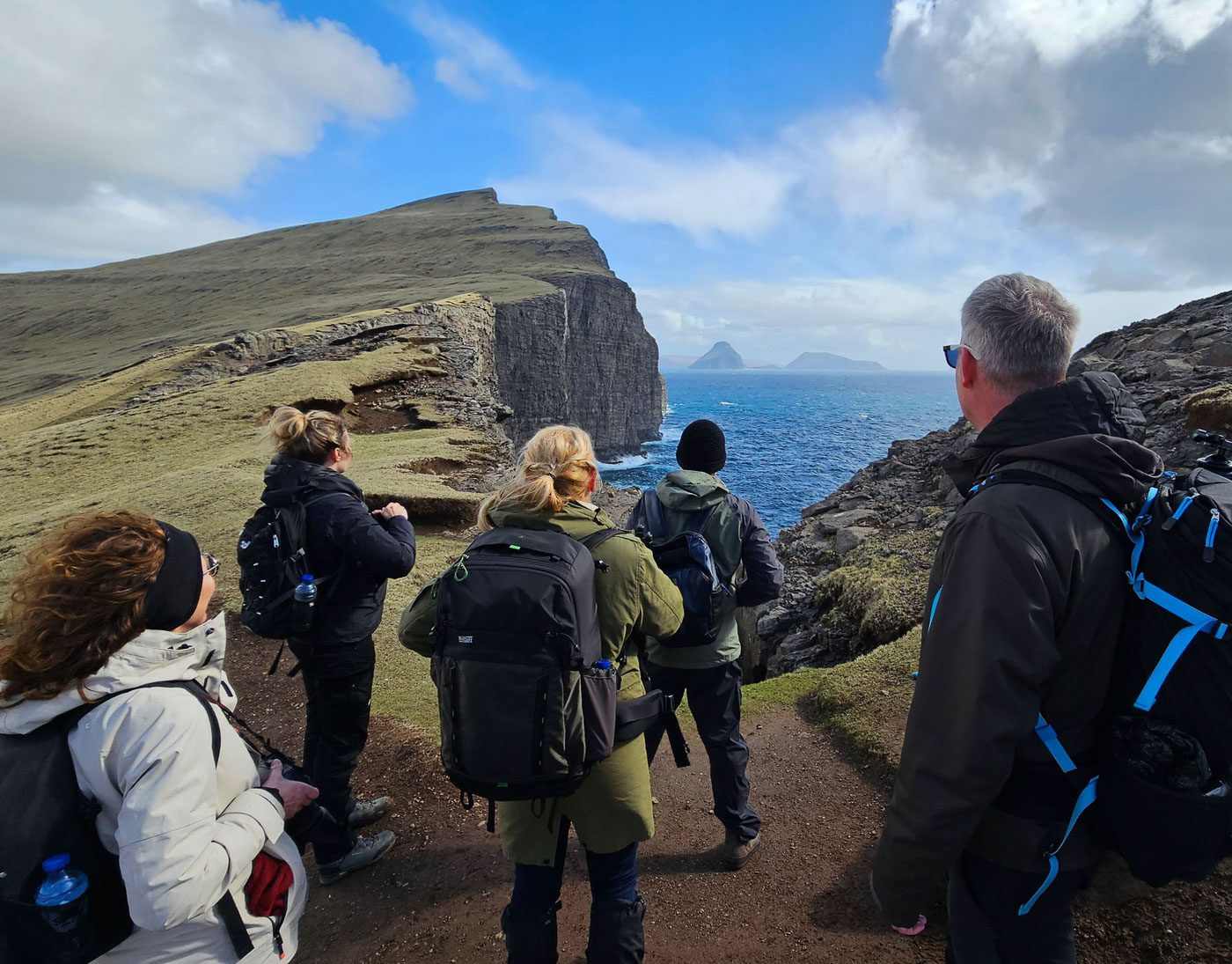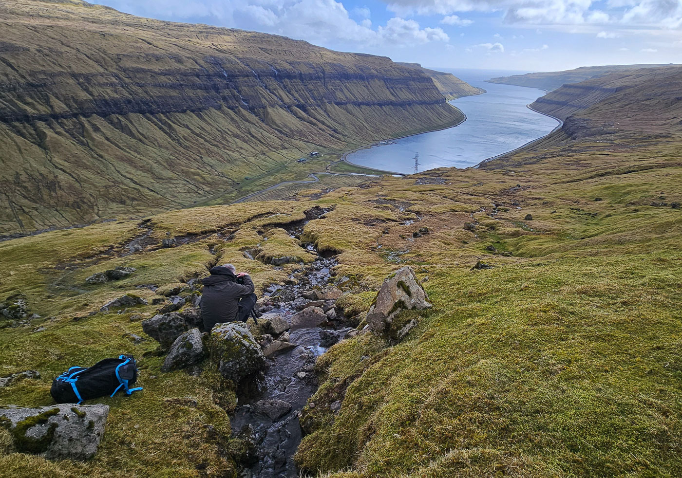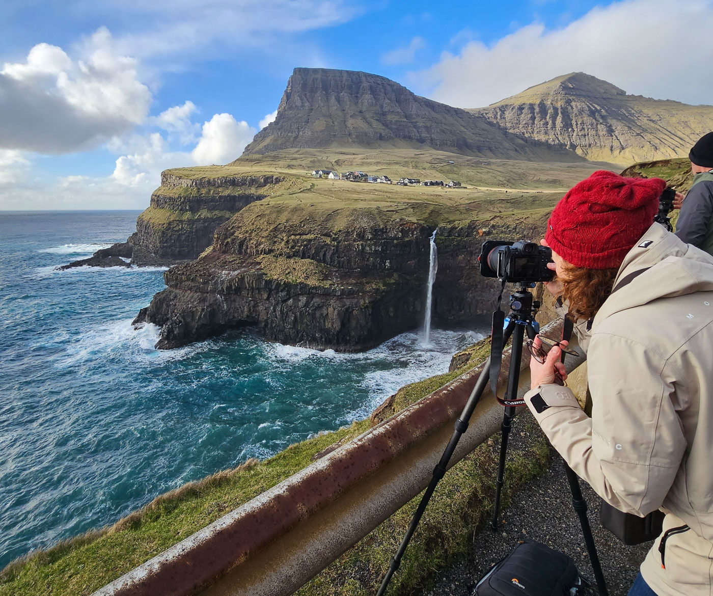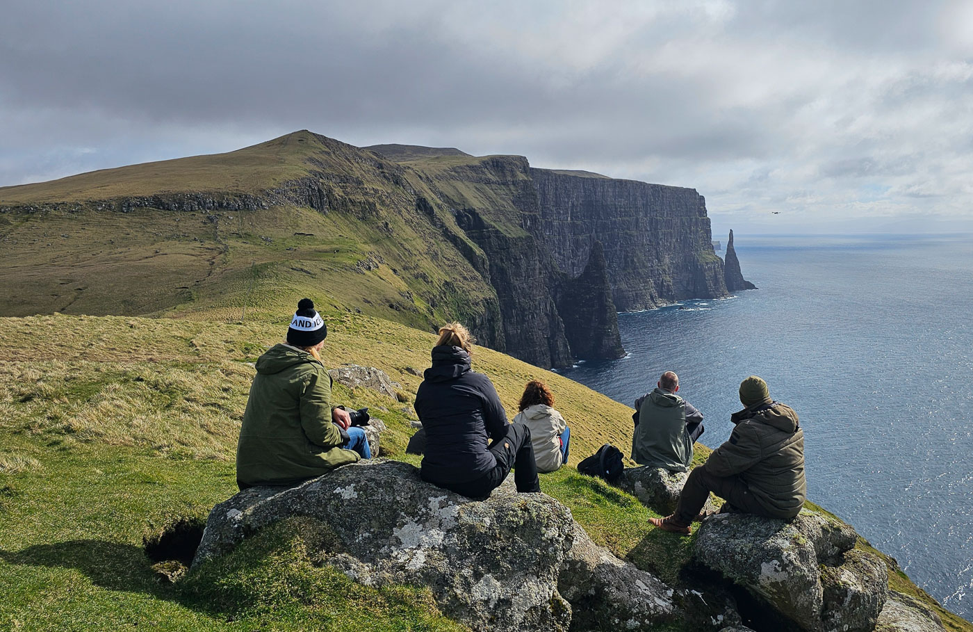 De volgende dag trokken we er meteen op uit. Zwaarbewolkt, maar droog genoeg om op pad te gaan. Vanaf Sornfelli genoten we van het uitzicht over de fjorden, daarna door naar het meer boven de zee – Sørvágsvatn. Wind tegen, zon mee. Wat een plek! Op de terugweg zagen we een regenboog precies boven de Witches Finger – dat soort momenten kun je niet plannen, je moet ze pakken. En deze groep deed dat. Statief neer, klik, kippenvel.