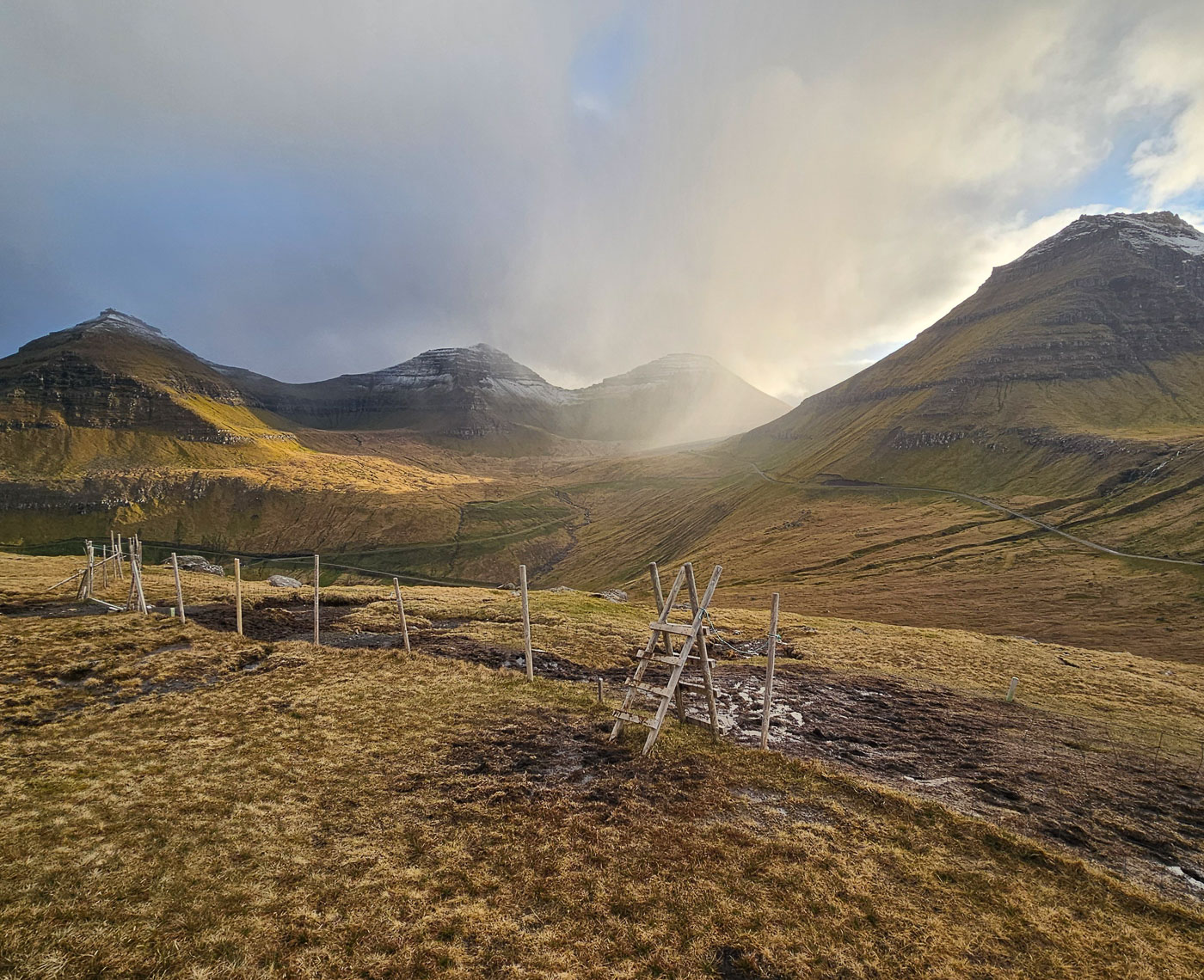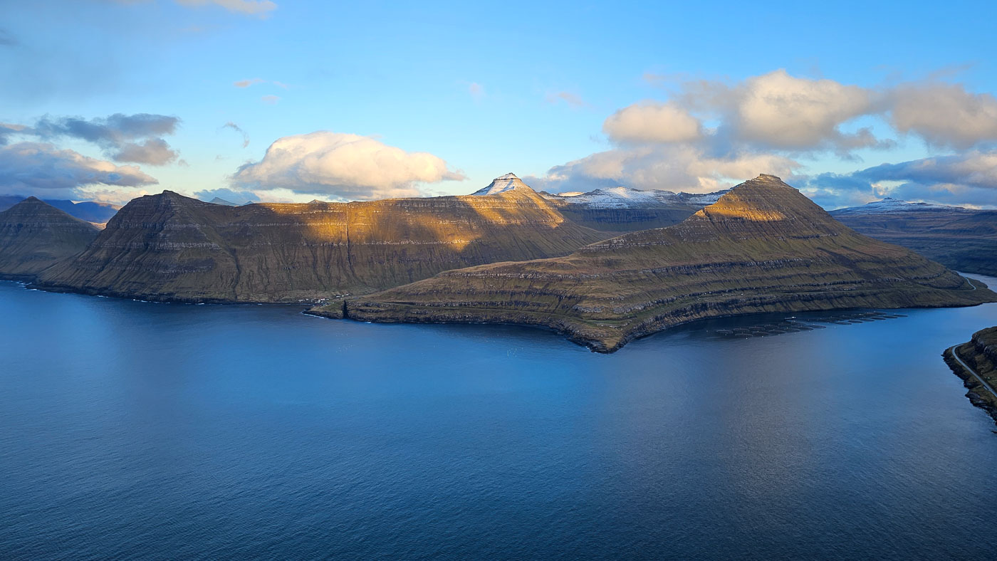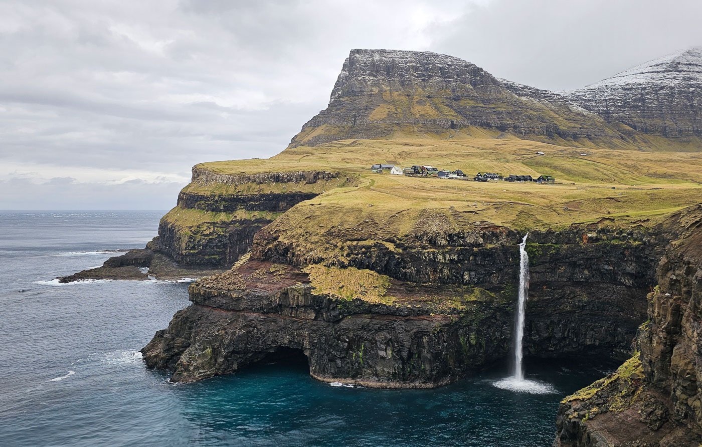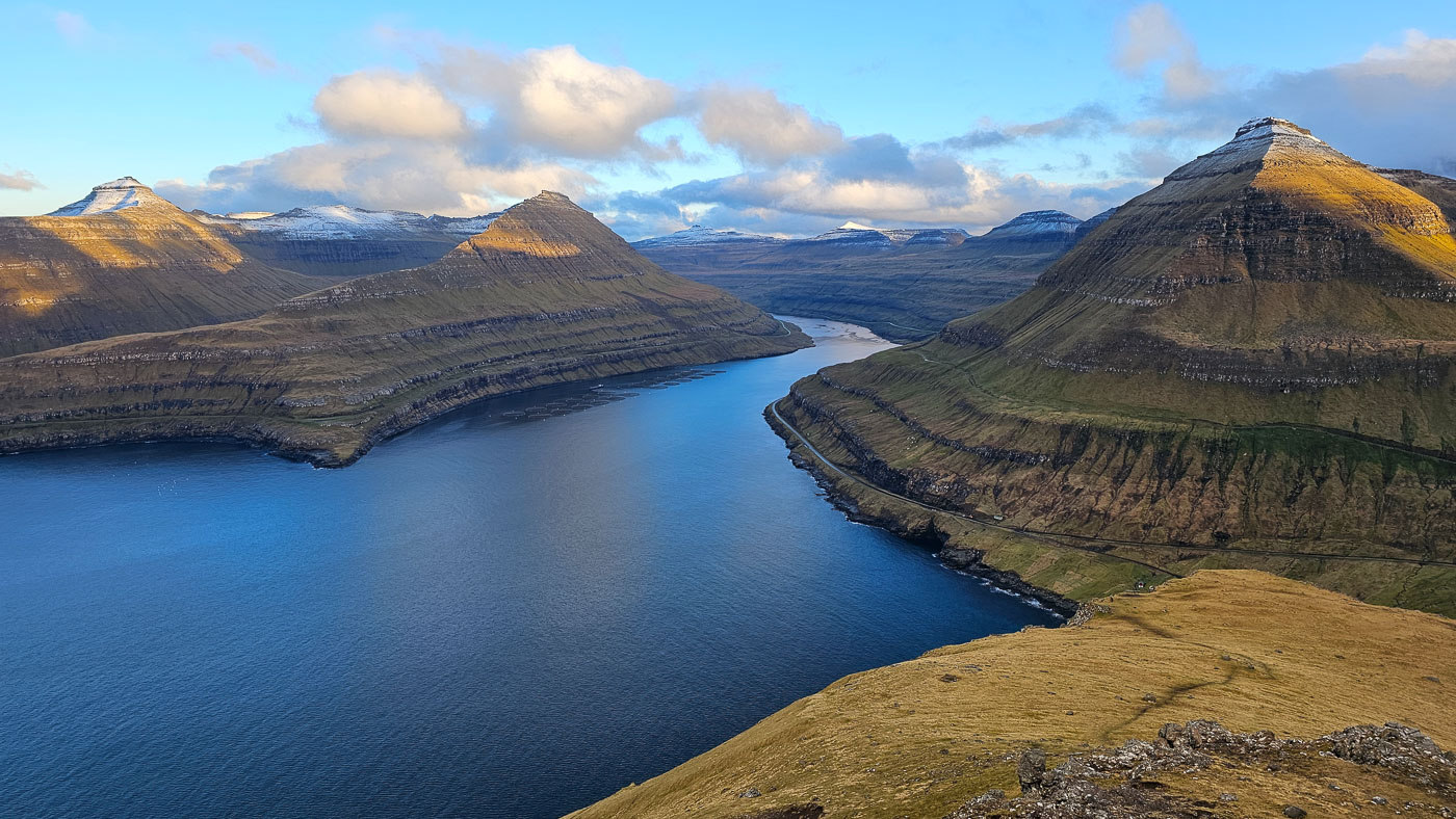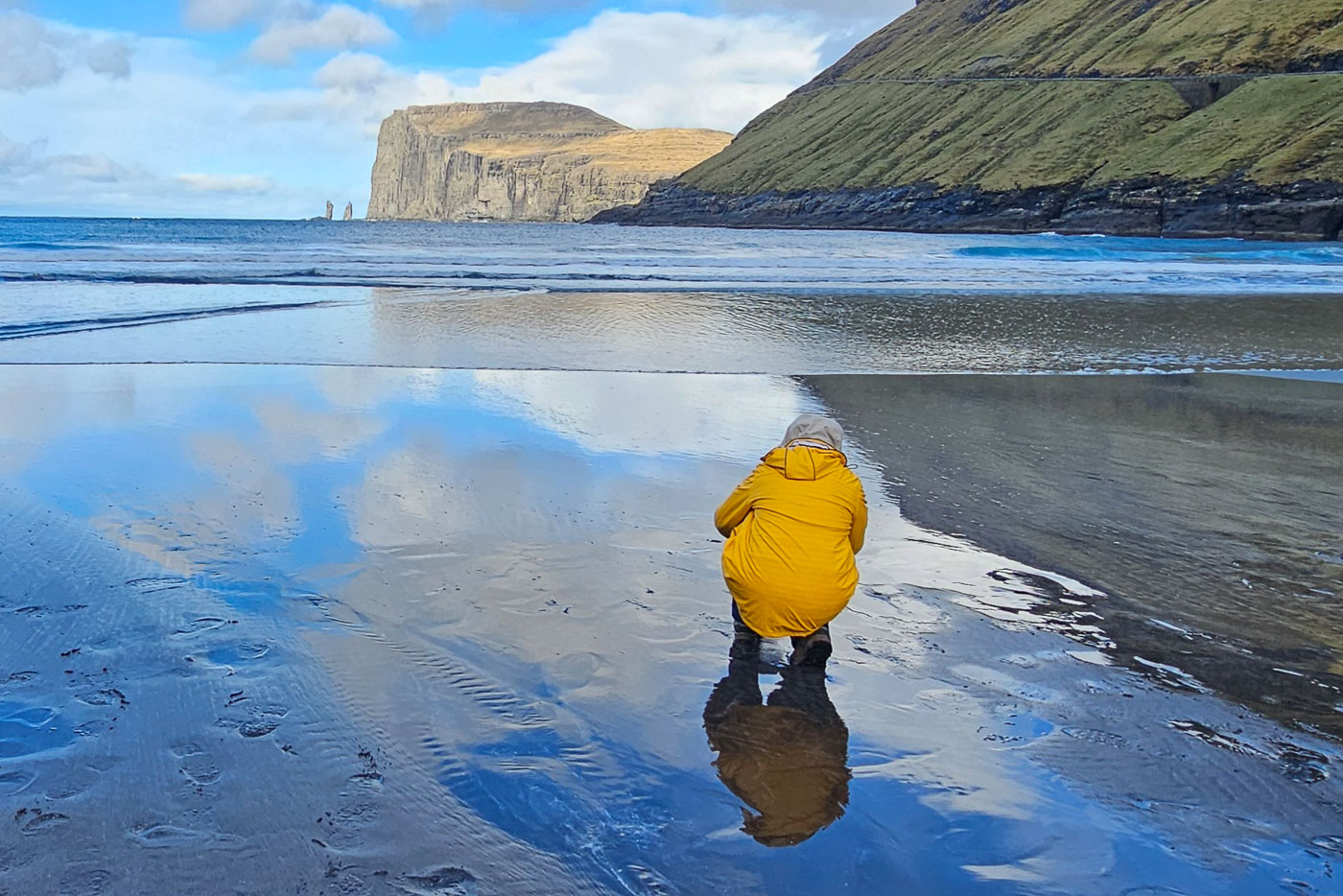 Het weer bleef de rest van de week wisselvallig, maar we lieten ons niet tegenhouden. In Saksun kwamen we ondanks het nieuwe reserveringssysteem toch binnen, dankzij een praatje met de eigenaar. In Tjørnuvík speelden we met reflecties in het natte zand, in Gjógv beklommen we een berg voor zonsondergang, net op tijd om boven nog een gouden lichtshow mee te pakken. Zelfs een kleine sneeuwbui onderweg hield ons niet tegen – eerder maakte die het uitzicht alleen maar indrukwekkender.