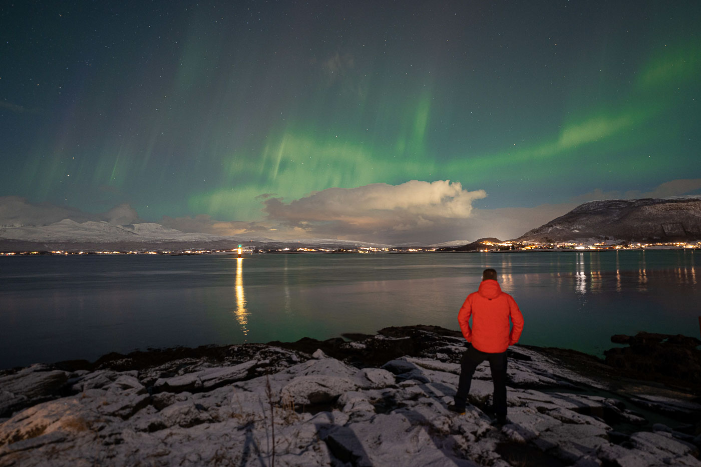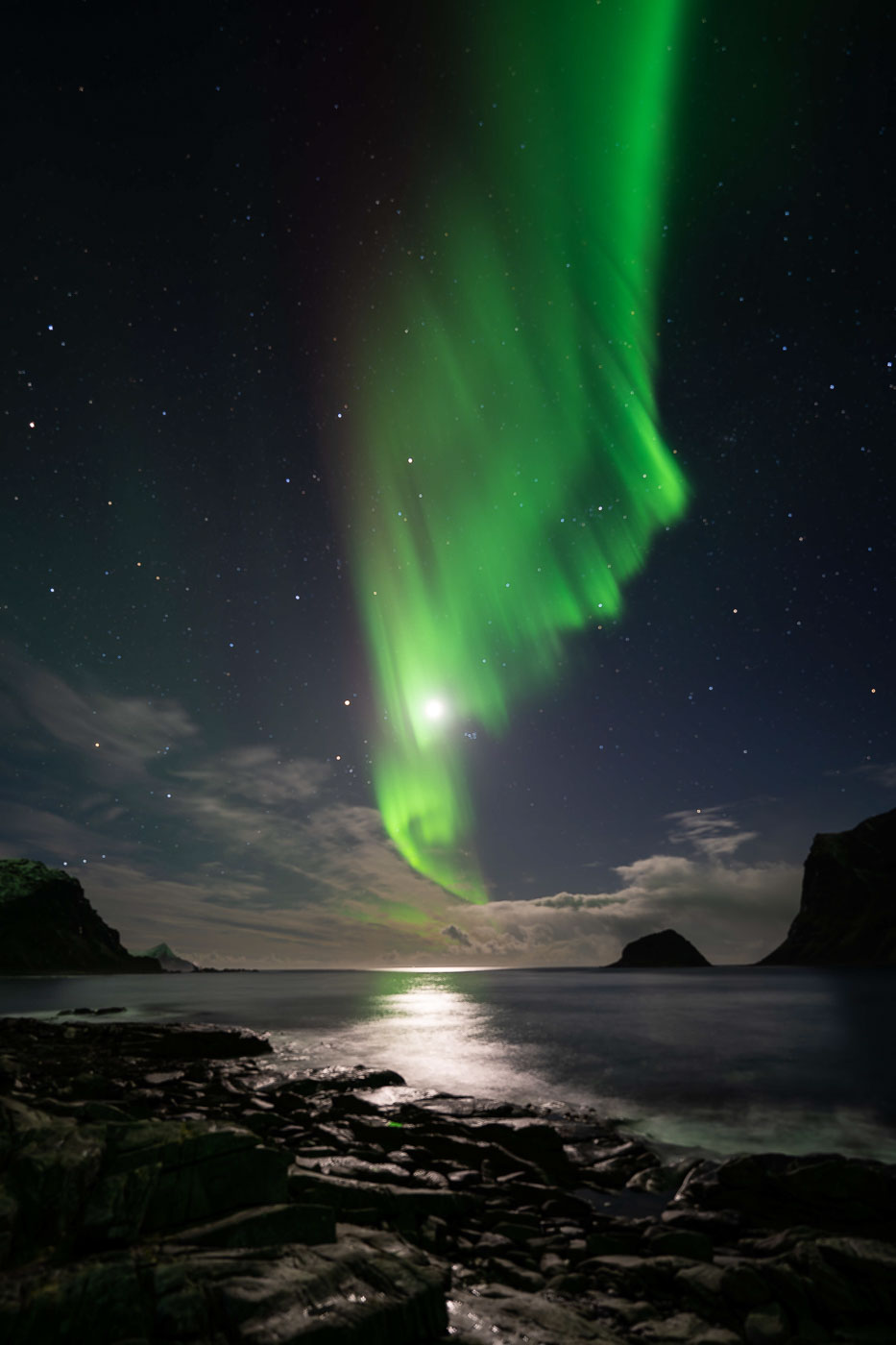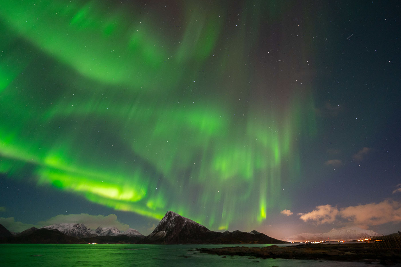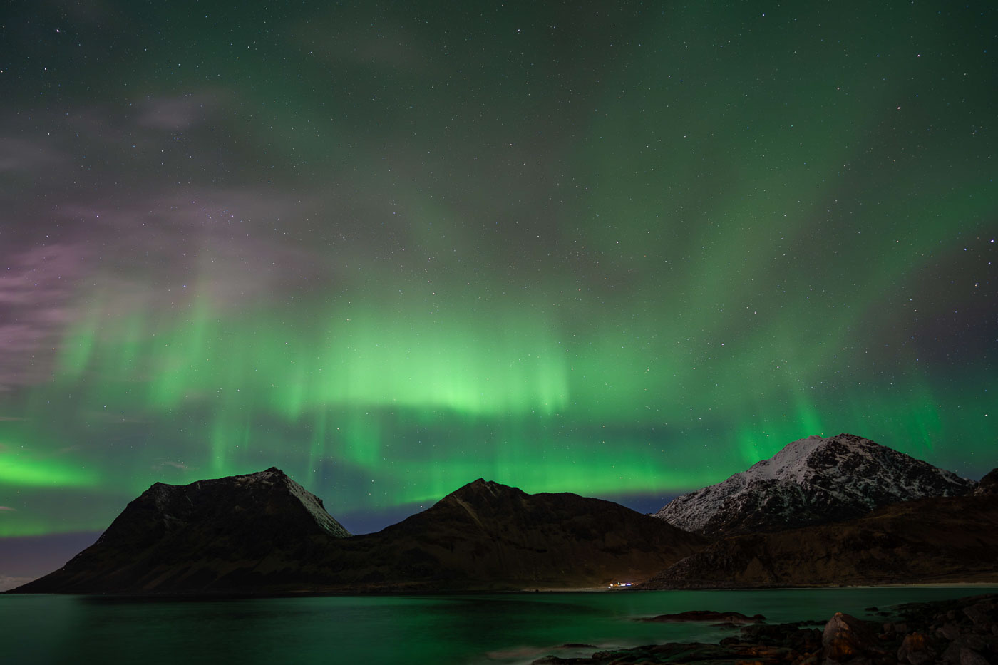 De eerste avond trokken Marc en de deelnemers er op uit naar Vik beach, met uitzicht op de iconische berg Mannen bij Haukland. Terwijl het maanlicht het landschap zacht verlichtte, dansten de eerste lichtgolfjes aan de hemel – voor velen een magisch moment en de allereerste keer dat ze het noorderlicht met eigen ogen zagen.