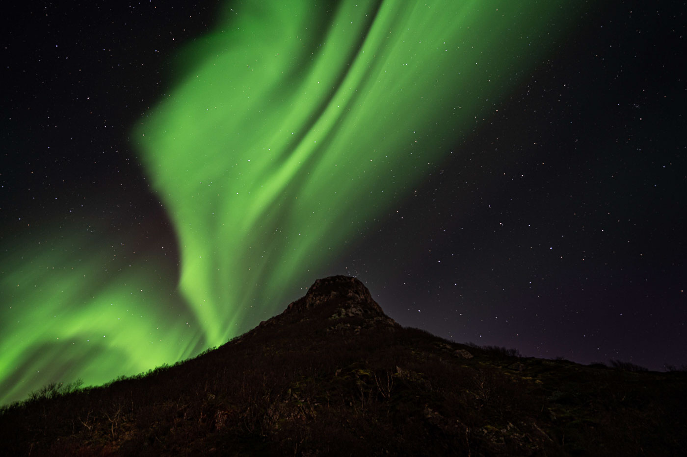 Ook de tweede avond was raak. Deze keer zochten ze een plek bij Drogstolen, met uitzicht op de bergen rond Leknes. Het noorderlicht liet zich kort zien, maar was wederom krachtig en betoverend.