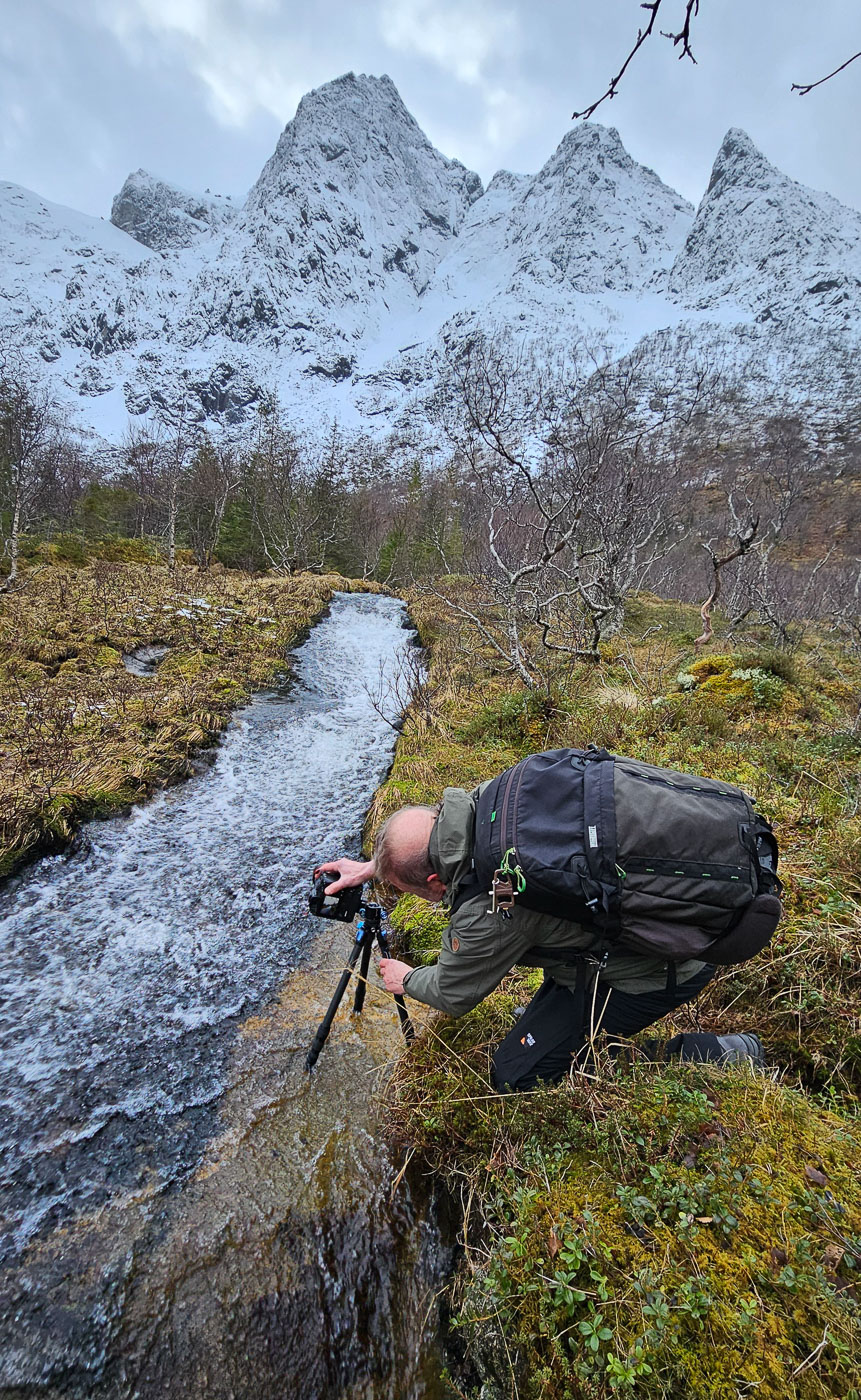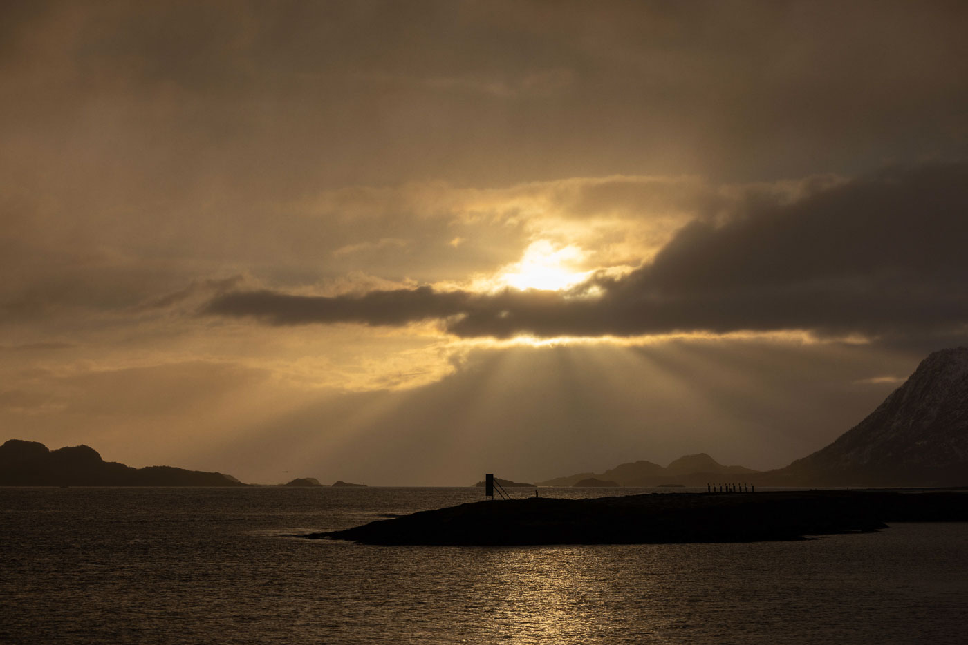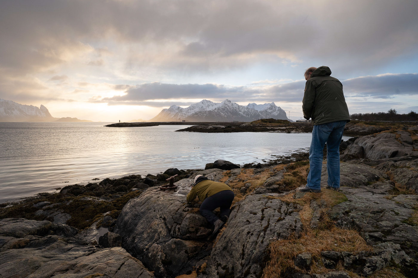 Tijdens een vroege ochtendshoot nabij het vliegveld van Svolvær kwamen Marc en twee deelnemers terecht bij een roestige bolder op een rots – een prachtige plek om het eerste zonlicht van de dag vast te leggen. Vlak na het maken van de beelden trok een hagelbui over: typisch Lofoten!
