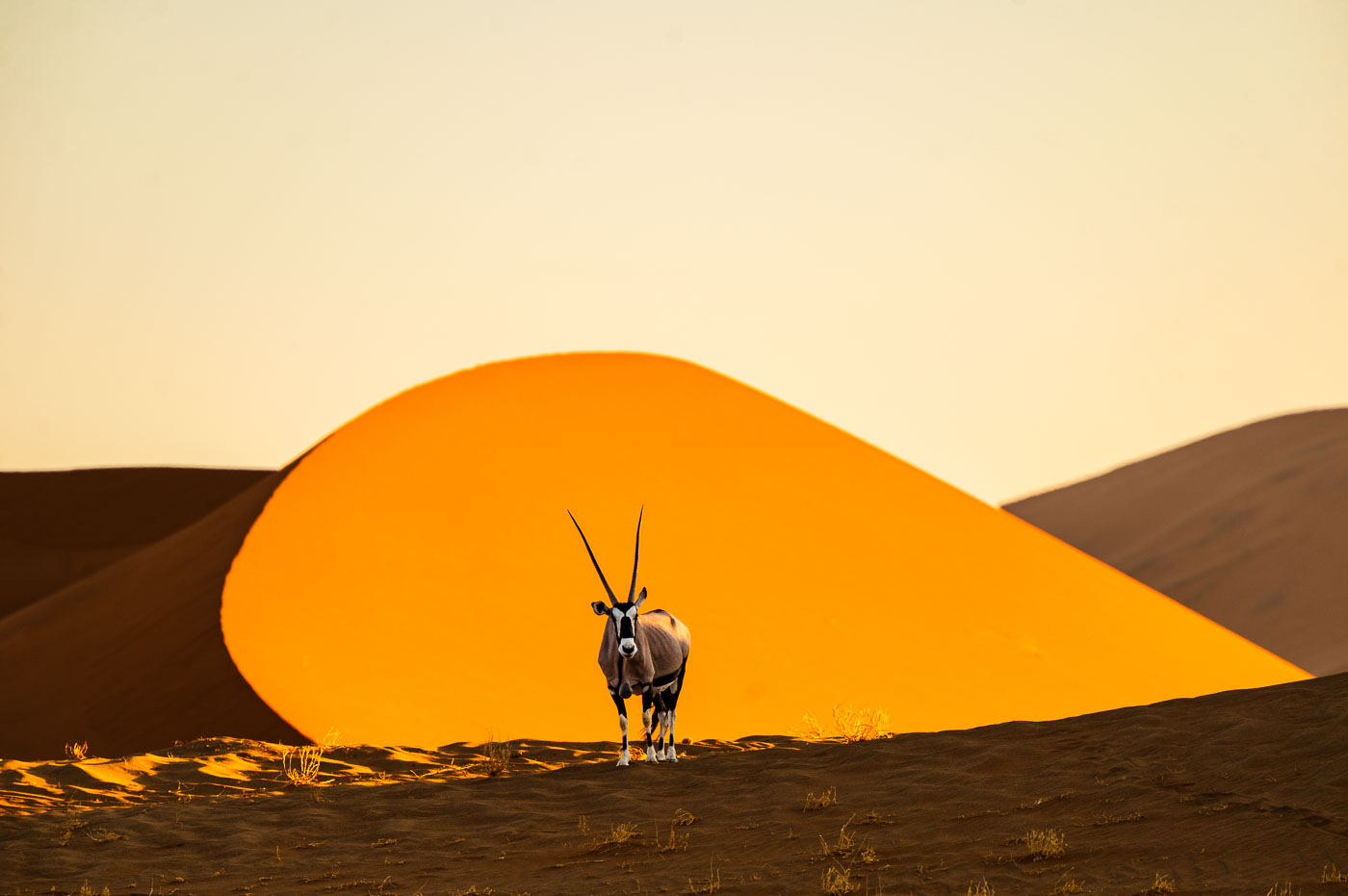 We landen uiterlijk om 10.00 uur in Windhoek. Voor wie wil, is het mogelijk een dag eerder aan te komen om even te acclimatiseren. Vanuit de luchthaven rijden we direct naar de iconische Sossusvlei. Onze lodge ligt midden in het nationaal park bij Sesriem, waardoor we morgen extra vroeg kunnen vertrekken om het beste licht te vangen. Als de tijd het toelaat, fotograferen we vanavond al de indrukwekkende omgeving. Na een lange reisdag genieten we van een heerlijk diner en rusten we uit voor een spectaculaire dag.