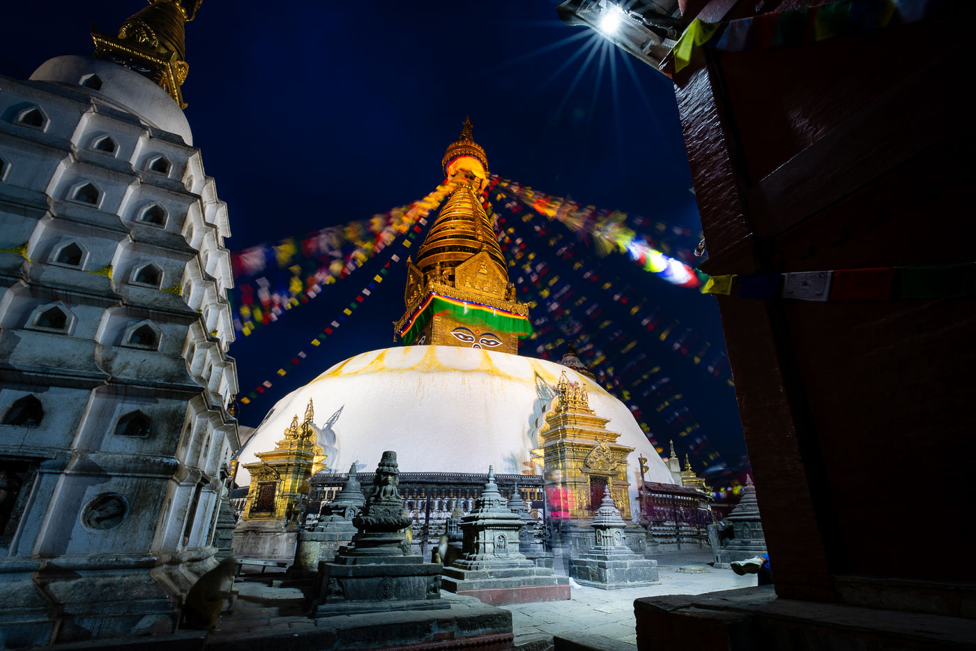 Bodnath is een van de grootste stoepa’s ter wereld. Rondom cirkelen gelovigen met gebedsmolens, de sfeer is sereen. Vanaf een dakterras maken we foto’s bij het vallen van de avond. Een gouden tip: speel met tegenlicht wanneer de zon achter de stoepa zakt. De silhouetten van mensen in gebed geven je foto’s diepgang en emotie.