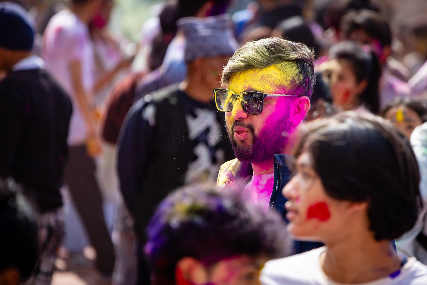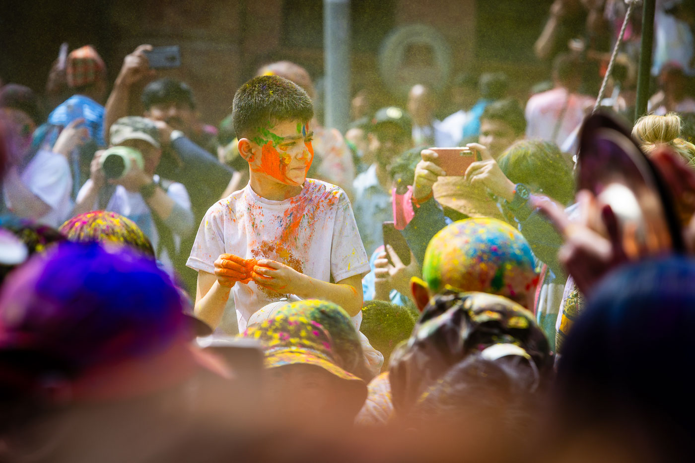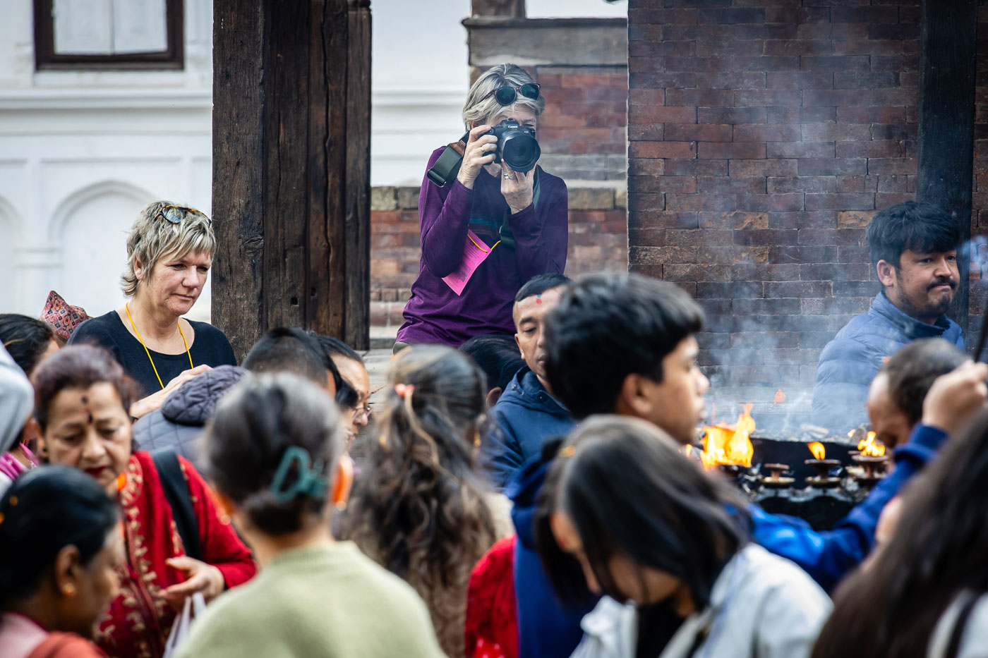 En dan: Holi! Met plastic hoezen om onze camera’s trekken we eropuit. In de straten van Kathmandu worden we begroet met poeder, waterballonnen en heel veel ‘Happy Holi!’. Durbar Square verandert in een explosie van kleur en emotie. Een tip voor festivalfotografie: fotografeer op burst-modus om het juiste moment te vangen. En wissel tussen close-ups en overzichtsbeelden voor een compleet verhaal.