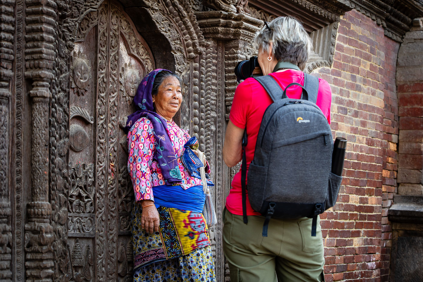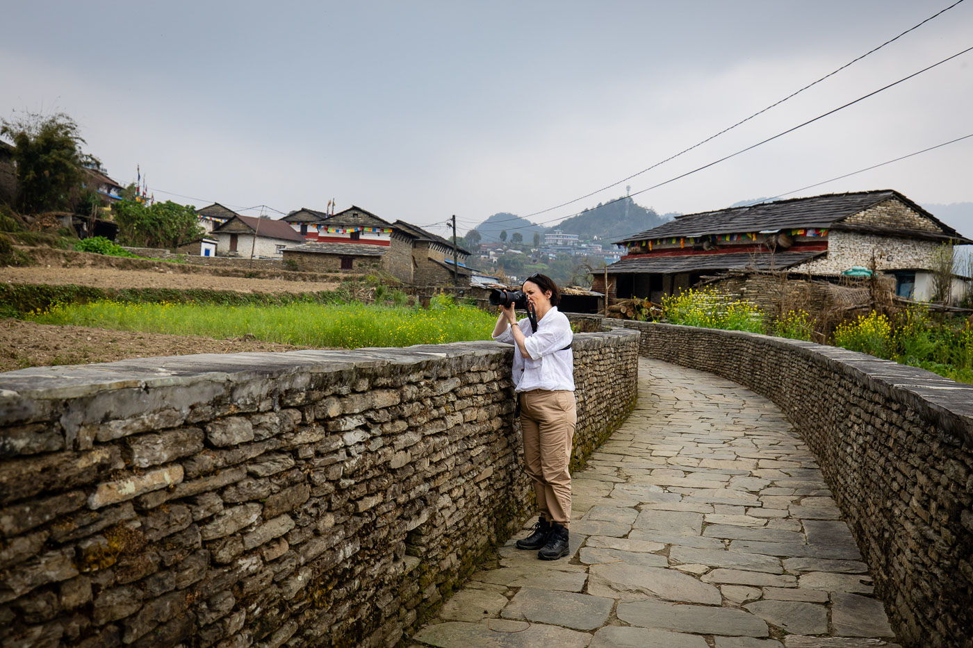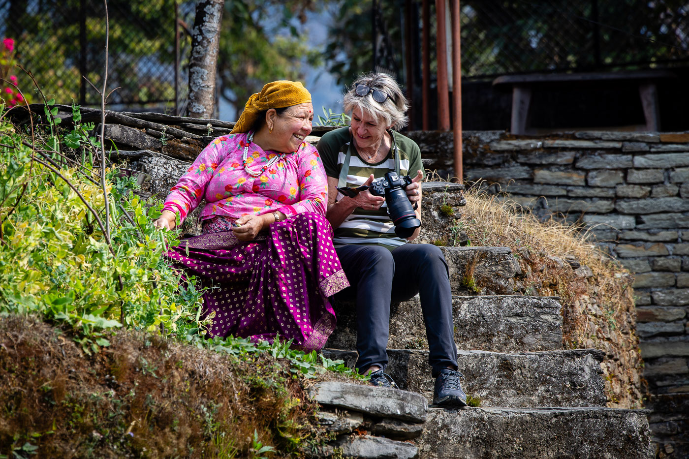 In het traditionele bergdorp Dhampus fotograferen we het dagelijks leven. Een van de deelnemers helpt zelfs met het sjouwen van stenen op haar hoofd – pure storytelling! In dit soort dorpen is het belangrijk respectvol te fotograferen: vraag toestemming, stel je even voor en toon je foto achteraf. Dit levert vaak mooie contacten én spontane portretten op.