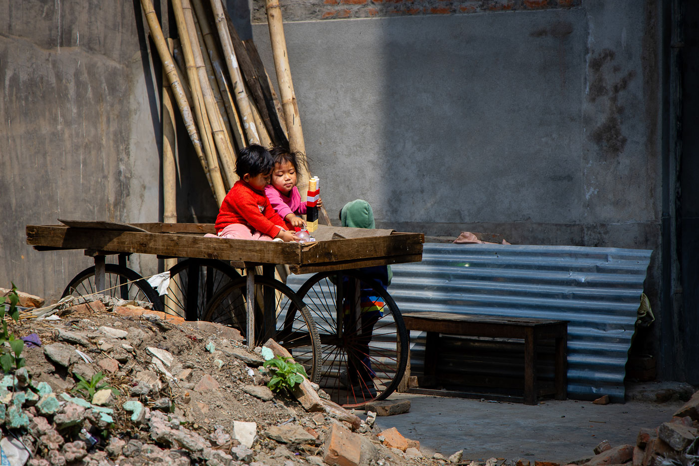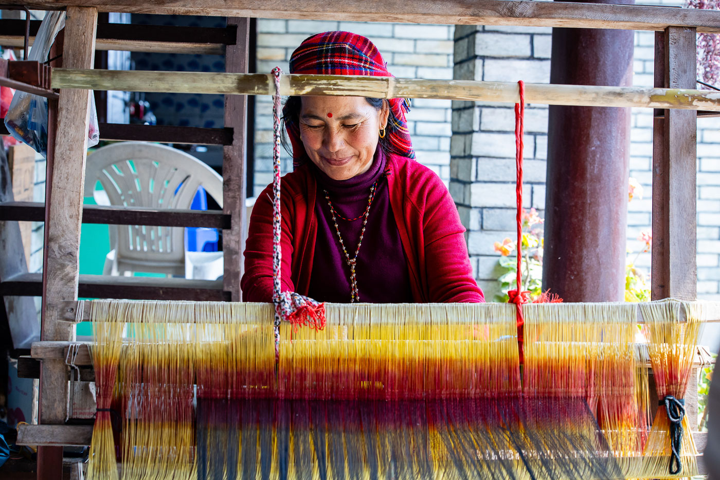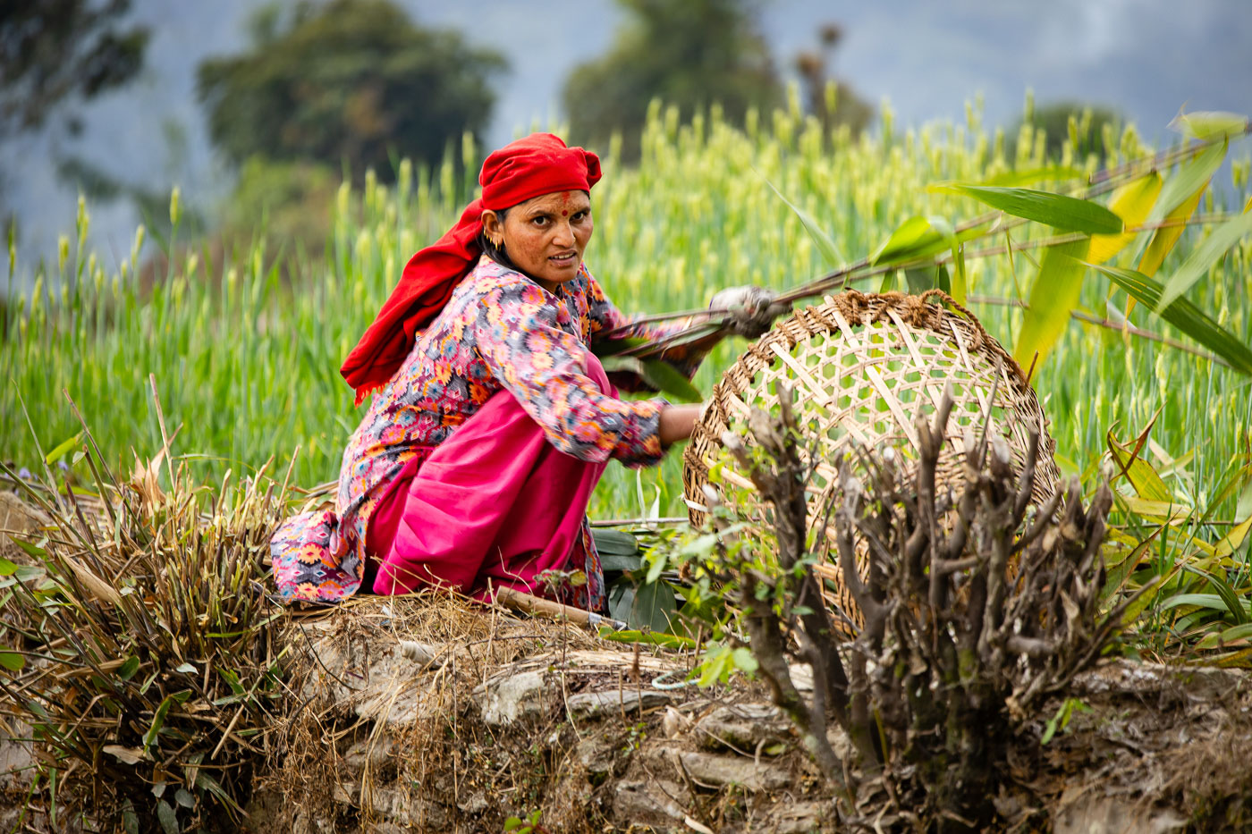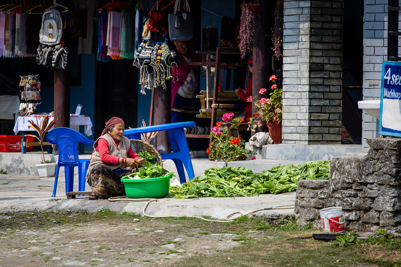 In het traditionele bergdorp Dhampus fotograferen we het dagelijks leven. Een van de deelnemers helpt zelfs met het sjouwen van stenen op haar hoofd – pure storytelling! In dit soort dorpen is het belangrijk respectvol te fotograferen: vraag toestemming, stel je even voor en toon je foto achteraf. Dit levert vaak mooie contacten én spontane portretten op.
