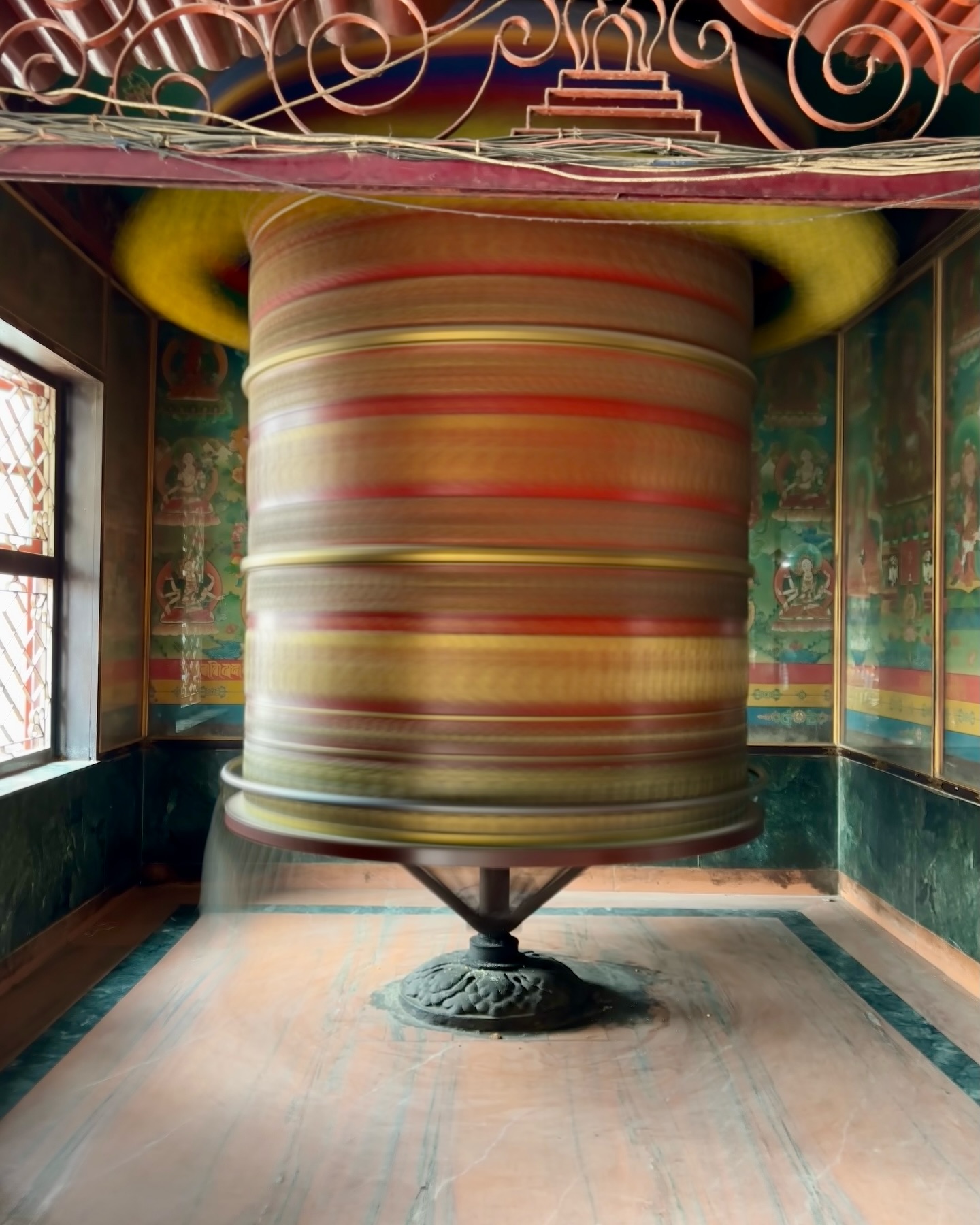 Ook de stupa wordt uitgelicht en even voor 19:00 uur lopen we de trappen af, helemaal naar beneden naar de grote bidrol, de voeten van Buddha en de taxi. Het is een korte rit terug naar het hotel. We leggen de spullen weg en gaan naar het restaurant om de hoek. Morgen weer een mooie lange dag!