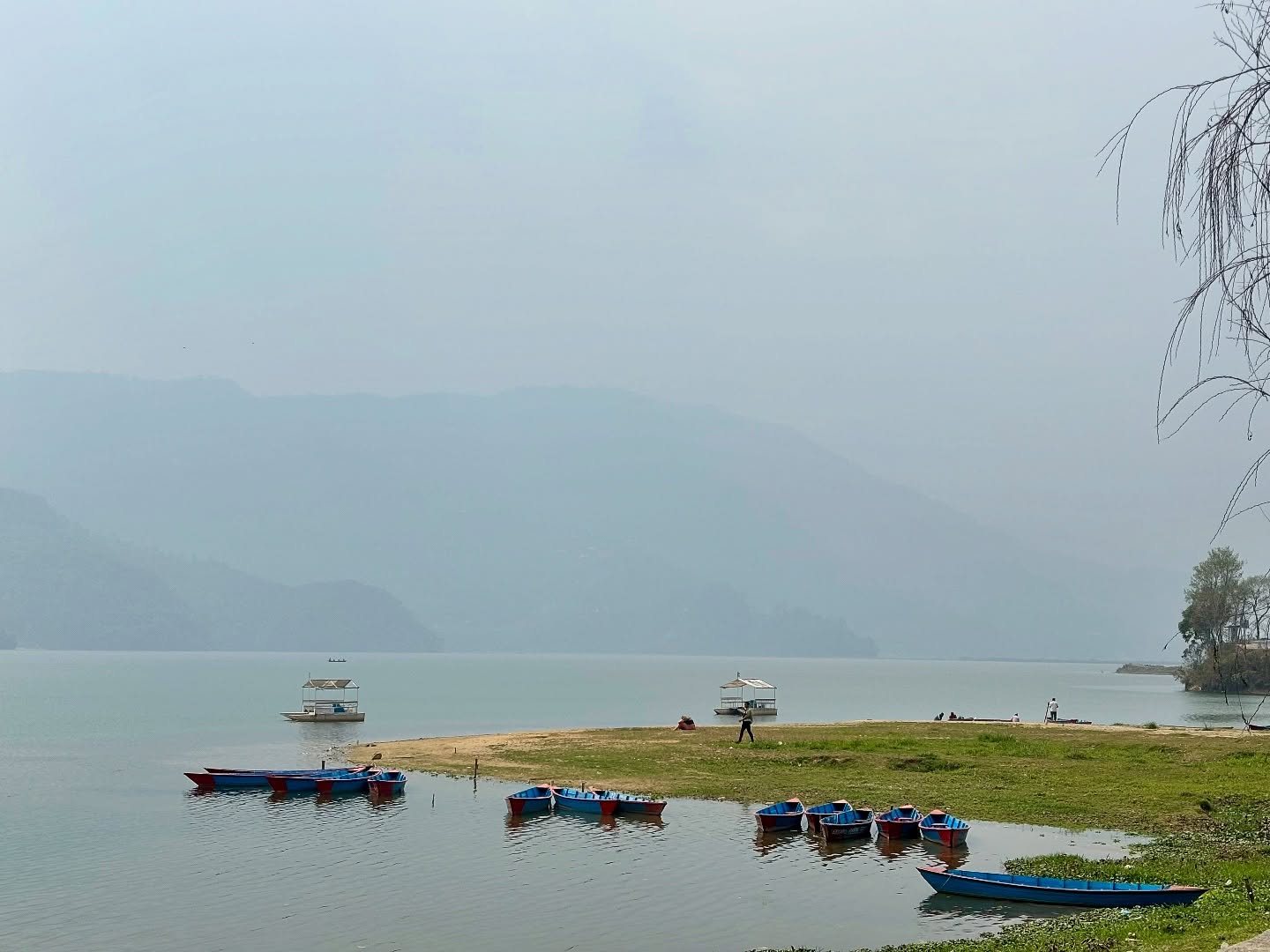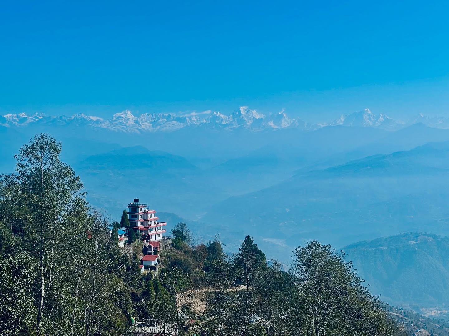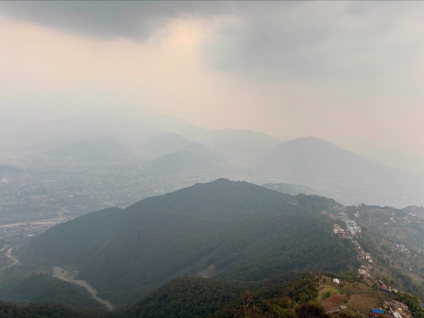Om 11:30 is ineens de vlucht van het bord en moeten we kennelijk boarden. Eerst naar de bus, het duurt even voor die vertrekt. Dan in het vliegtuig en gelukkig vertrekken we dan toch even na 12 uur. Het is een soepele vlucht en even voor 12:45 landen we in Pokhara. Het is 24 graden maar wel erg heiig. Geen bergen gezien onderweg. De taxi staat klaar en hij brengt ons naar Sarangkot, bovenop de berg. Daar staat ons hotel en daar is de viewtower. Prachtig uitzicht over de Himalaya, als het niet regent of mistig is.
