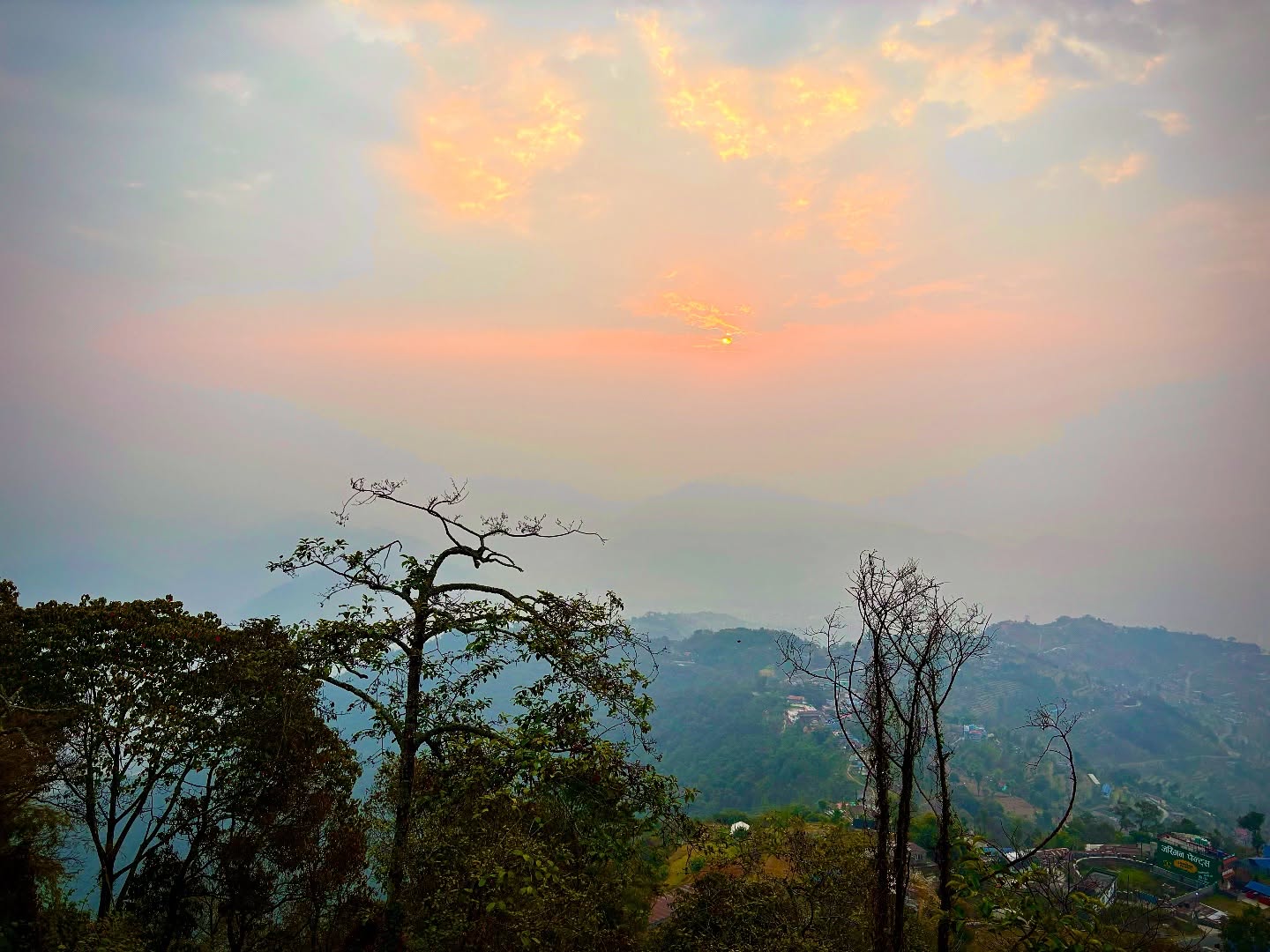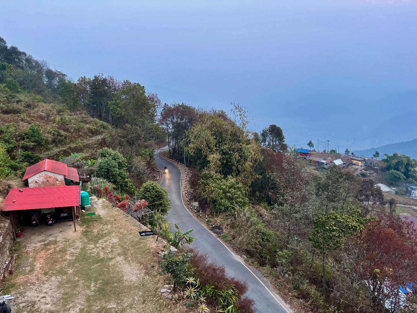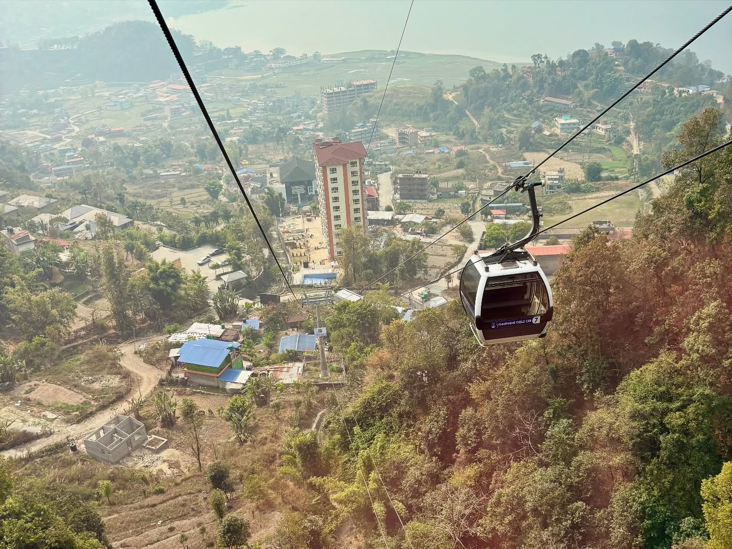 Om 11:30 is ineens de vlucht van het bord en moeten we kennelijk boarden. Eerst naar de bus, het duurt even voor die vertrekt. Dan in het vliegtuig en gelukkig vertrekken we dan toch even na 12 uur. Het is een soepele vlucht en even voor 12:45 landen we in Pokhara. Het is 24 graden maar wel erg heiig. Geen bergen gezien onderweg. De taxi staat klaar en hij brengt ons naar Sarangkot, bovenop de berg. Daar staat ons hotel en daar is de viewtower. Prachtig uitzicht over de Himalaya, als het niet regent of mistig is.