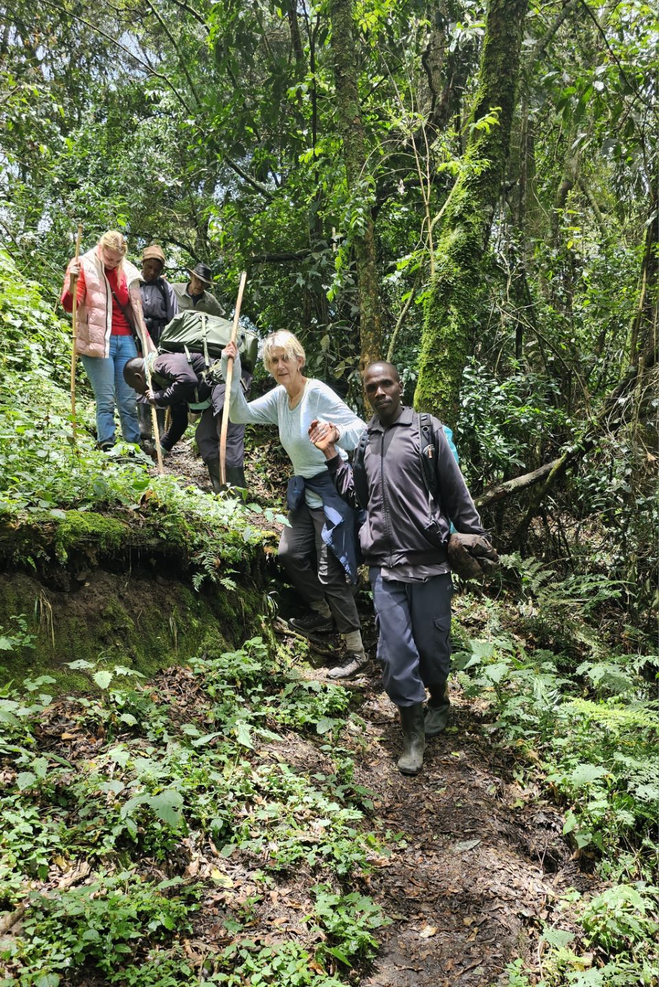 Na een koele nachtrust schuiven we aan bij ontbijt. We zijn de enige in de lodge. Helaas begint het te regenen dus dat wordt zwoegen in een regenjas op zoek naar de gorilla’s. We gaan naar het centrum, krijgen eerst een welkomstoptreden van de plaatselijke dans en zang groep waarna we de instructies voor het bezoek aan de gorilla’s krijgen. We gaan op zoek naar de gorilla’s. De regen valt mee en na 1,5 uur door de bergen trekken komen we bij de gorilla’s. Ze blijven verder naar beneden schuiven dus helaas komen we niet op ooghoogte met de grote dames en heren. Dit wordt goed gemaakt door een aantal jongen. Na 1 uur moeten we weer weg en begint de wandeling terug. Weer 1,5 uur terug. Valt absoluut niet mee bergje op en af door het regenwoud rond de 2200 meter. Uitgeput stappen we de auto en rijden we naar Lake Bunyonyi. We hebben een mooie lodge op een van de eilanden en kunnen rustig bijkomen.