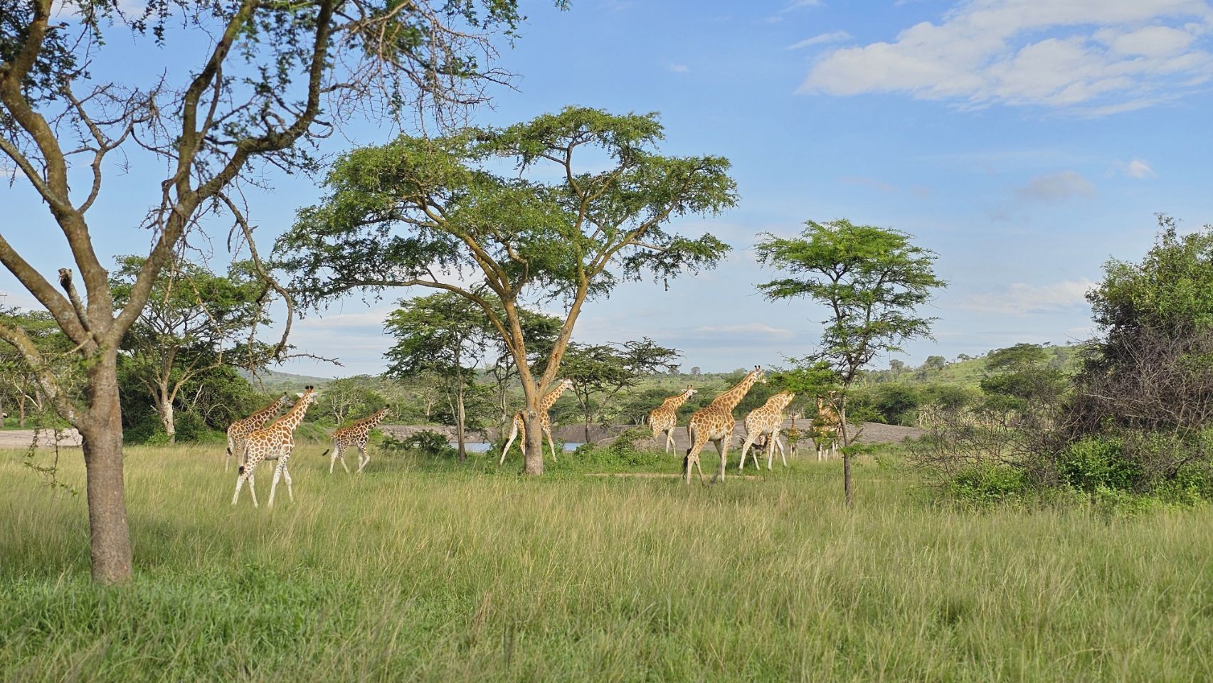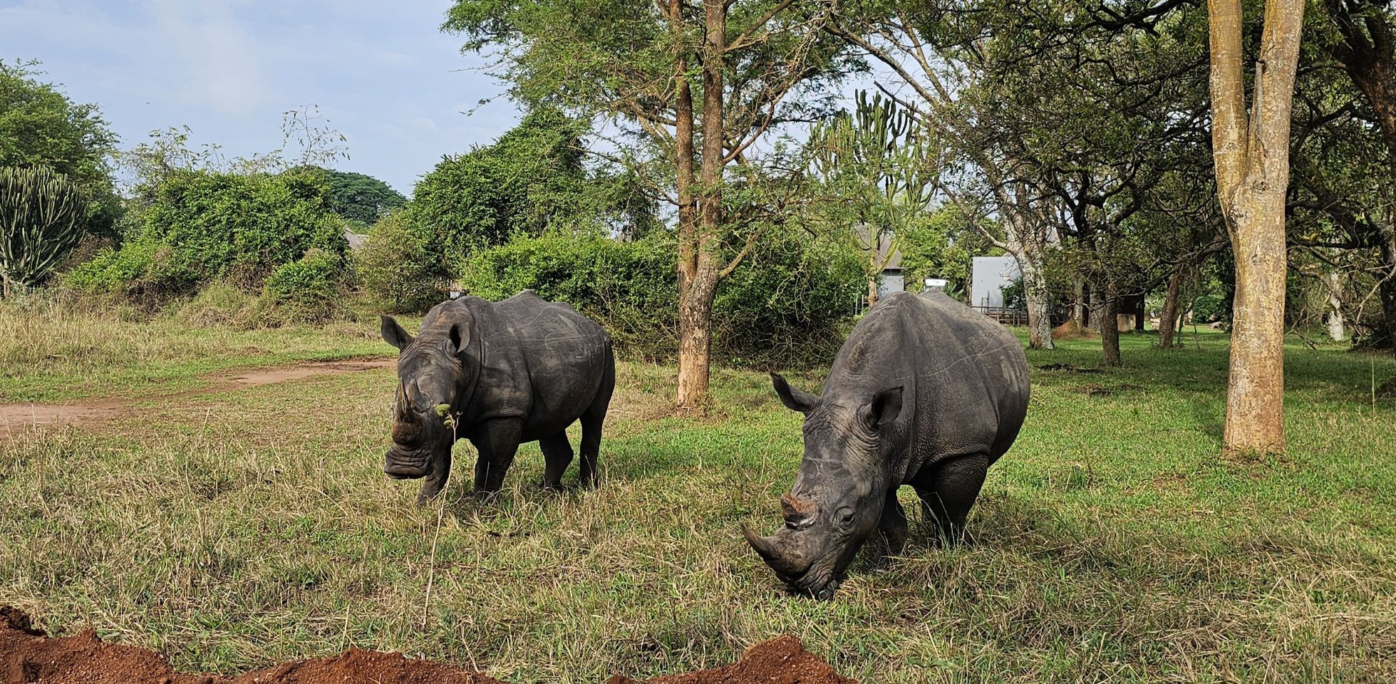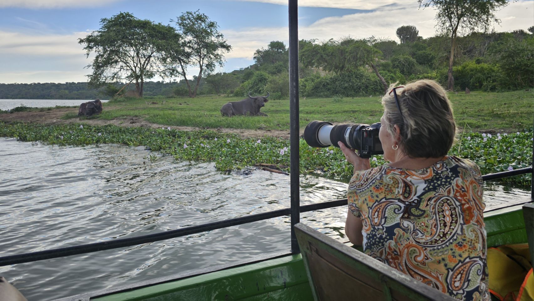 Vandaag om 7 uur het bed uit want er kunnen neushoorns bij de lodge rondlopen. Kom al snel een ranger tegen die mij voorbij de receptie stuurt. En daar staan de eeste 3 neushoorns. Wauw. Kijk eens rustig verder rond en daar nog 2. Nog een groep van 5. Karin gauw een berichtje sturen om ook naar buiten te komen en ondertussen tel ik in totaal 12 neushoorns. Ben echter iets te ver doorgelopen en wordt door de ranger terug geroepen. Na ruim een uur is het tijd voor ontbijt. We bekijken nog wat van de andere accomodaties en vertrekken daarna naar Murchison Fall National Park. Eerste stop is de watervallen waarna we een gamedrive in het park doen. We vinden vele soorten antilopen, waterbok, hartenbeest. Verder nog een paar olifanten in de verte, giraffes en twee leeuwinnen met kleintjes verscholen onder de struiken en honderden buffels is de opbrengst van vandaag. Weer een top dag in Uganda.