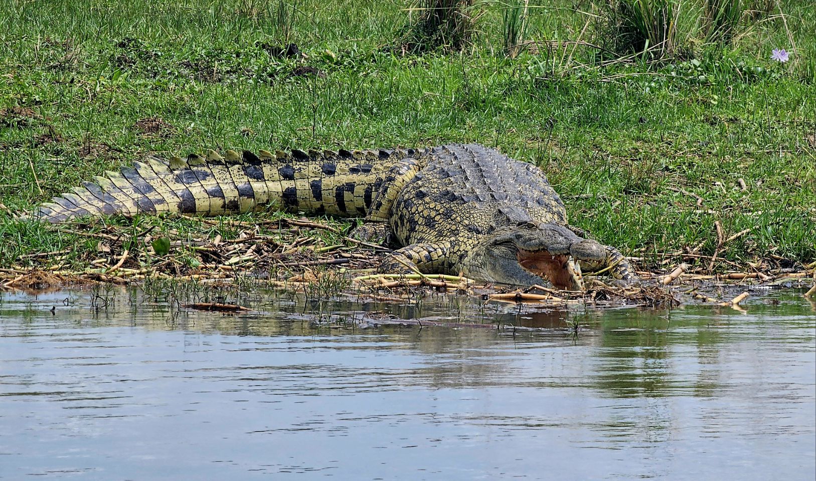 Vandaar weer bijtijds uit de veren. We moeten 460km afleggen naar Queen Elizabeth National Park. Na lange rit in de auto langs vele dorpjes en theeplantages met een fotostop bij de evenaar zijn we nog net op tijd voor een wildlife cruise over het Kazinga kanaal. Hier zien we weer veel nijlpaarden, krokodillen en allerlei watervogels. Weer aan wal is het al bijna donker en gaan we naar onze lodge.