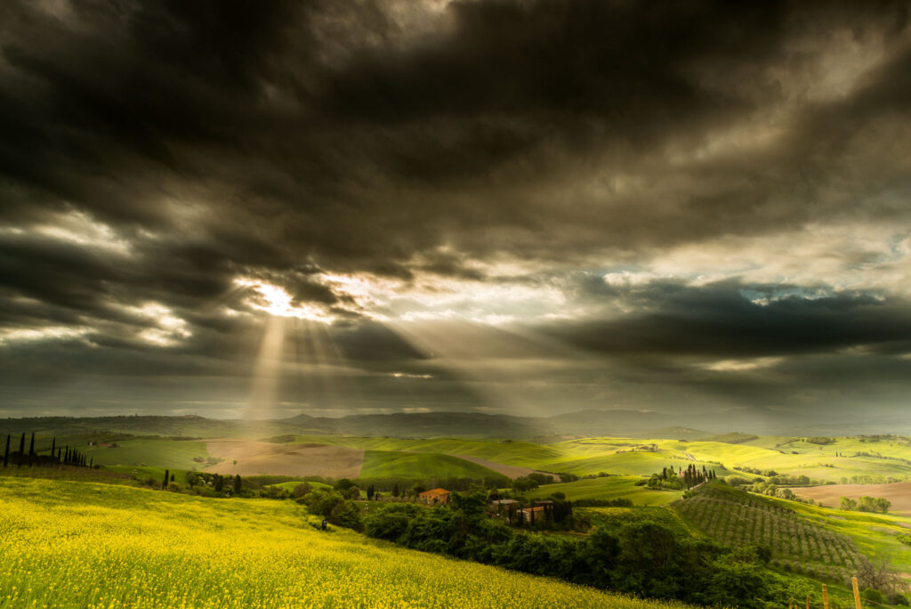 Mistige heuvels, cipressen en gouden avondlicht. Een klassieker in het najaar. Inclusief ballonvaart!